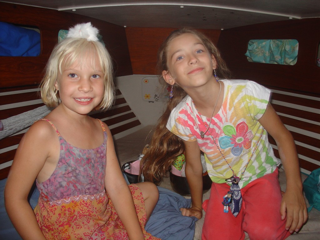 I posted a couple of days ago about Michelle’s update from the Rio Dulce. Michelle also mentioned in her email that Floyd, Lauren and Archer, her new friends on SV T. Maru, were St. Petersburg-bound from Rio Dulce. She said we really needed to try and meet them since 9-year-old Archer would be a perfect playmate for Lily. Archer is an accomplished shell jewelry designer, sails an Opti and climbs the mast quicker than anyone. Lily was, of course, intrigued. We finally caught up with them a couple of days ago. Lily, Archer and Sam spent yesterday catching fiddler crabs in the shallow rocks and collecting palm fronds to better disguise the “marina hideout”. Today, Lily and Archer walked downtown for a serving of gelato, did a little dumpster diving for marina hideout furnishings and are now telling “Cat in Fairyland” stories in the v-berth. Archer is Seattle-bound in just a few days. Lily is going to miss her new playmate unless she persuades her to make good use of the marina hideout by hiding from her parents.